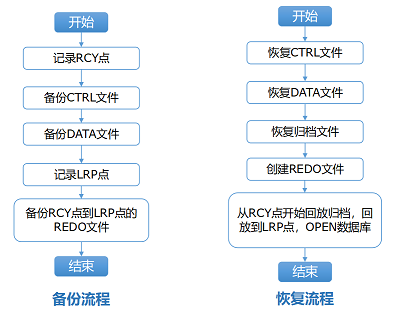 恢复程序要求数据库运行于NOMOUNT状态,执行时将备份集中的文件,以数据块为基本单位拷贝回数据库的文件中,并回放归档日志,对数据库进行一致性恢复。