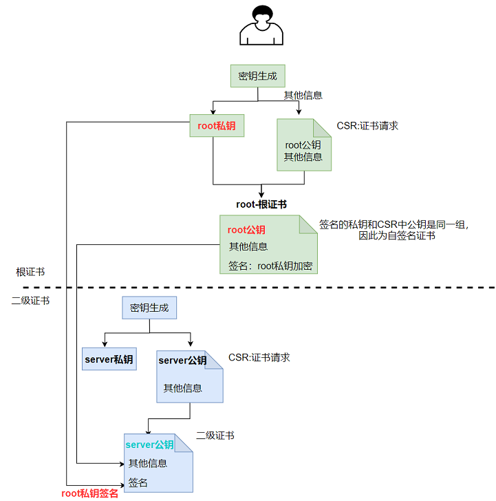 在服务端生成密钥对(公/私钥);生成根证书(自签名,包含服务端公钥);利用根证书生成二级证书,且用私钥进行签名。