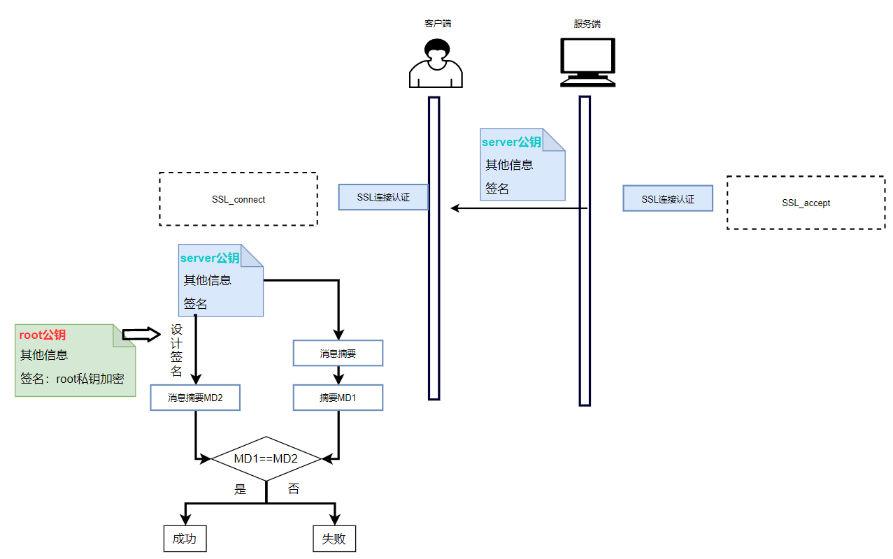 客户端保留着服务端根证书,服务端将其二级证书发送至客户端,客户端用root公钥设计签名,与计算的消息摘要对比,进行验证。