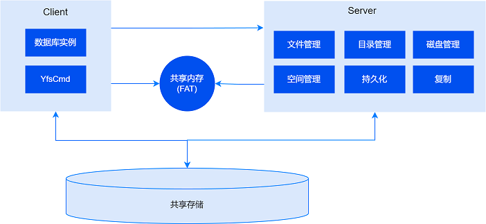 崖山集群文件系统采用与YCS共进程的架构,内嵌于YCS组件运行。提供文件系统以及磁盘组管理能力,用于管理共享存储。客户端与服务端采用UDS(Unix Domain Service)进行通信,同时通过共享内存同步文件系统的FAT(File Allocation Table,文件配置表)信息。