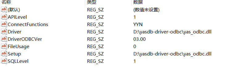 名称 数据类型 数据 值 说明 APILevel REG_SZ 0|1|2 1 一致性级别1,必须与SQLGetInfo中为 SQL_ODBC_INTERFACE_CONFORMANCE选项返回的值相同。 ConnectFunctions REG_SZ {Y|N}{Y|N}{Y|N} YYN 支持SQLConnect、SQLDriverConnect,不支持SQLBrowseConnect。 Driver REG_SZ driver-DLL-path yas_odbc.dll路径 DriverODBCVer REG_SZ nn.nn 03.00 驱动程序支持的 ODBC 版本,必须与SQLGetInfo中为SQL_DRIVER_ODBC_VER选项返回的值相同。 FileUsage REG_SZ 0|1|2 0 Setup REG_SZ setup-DLL-path yas_odbc.dll路径 SQLLevel REG_SZ 0|1|2 1 1 = FIPS127-2 过渡,必须与SQLGetInfo中为SQL_SQL_CONFORMANCE选项返回的值相同。 关于注册信息的更多详情,请参考ODBC官方文档驱动程序规范子项 - ODBC API Reference | Microsoft Docs (opens new window)。