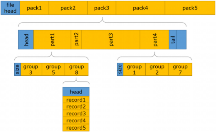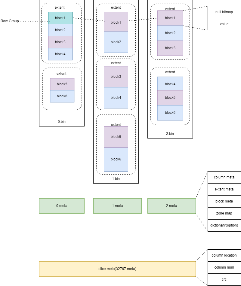 列数据文件:数据按固定行数,被分为多个block,多个block组成一个extent,每一列相同位置的block被称为RowGroup。