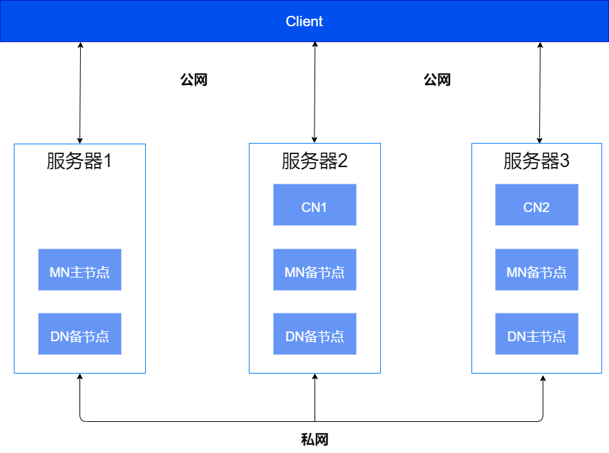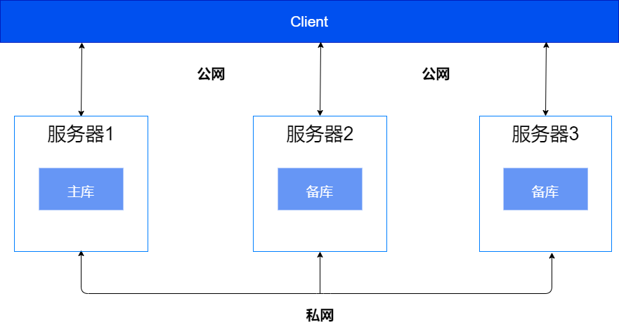 单机部署的典型组网如下图所示,该组网方案以一主两备为例,主库和各个备库建议分别部署在不同的服务器上。