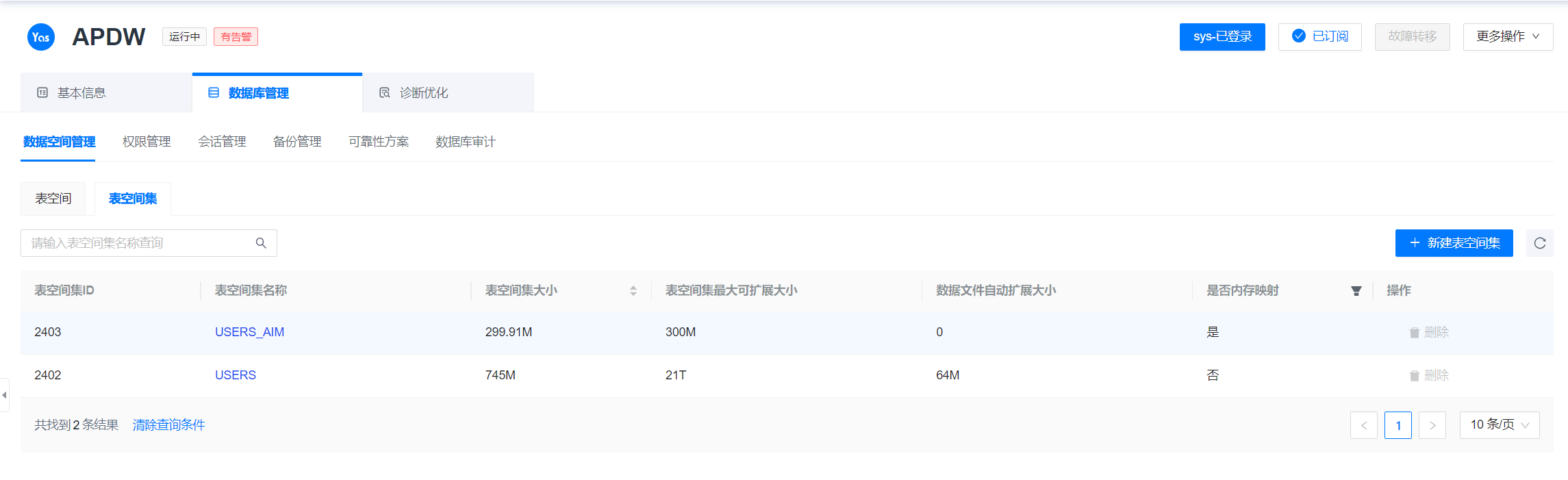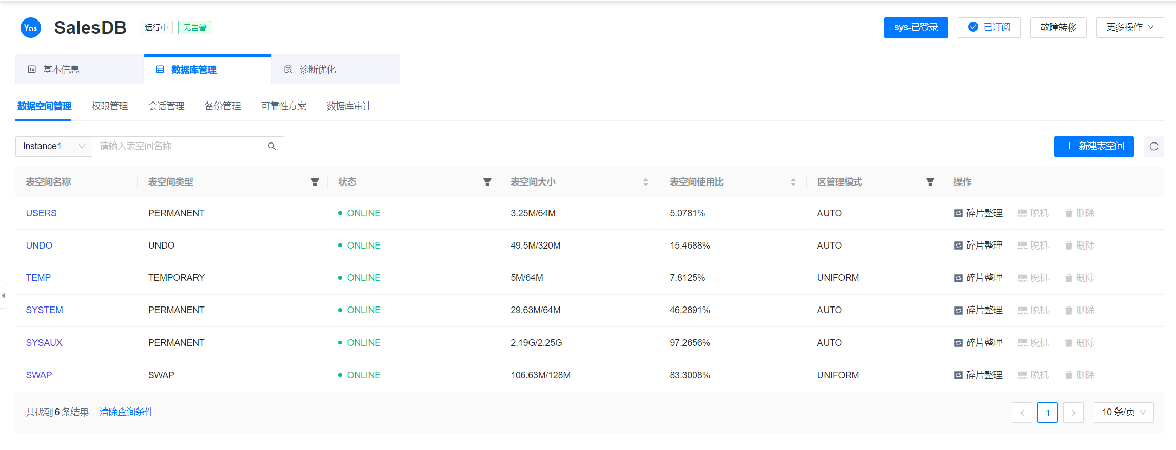 管理平台提供快捷管理表空间的功能,主要包括新建表空间、碎片整理和脱机等。