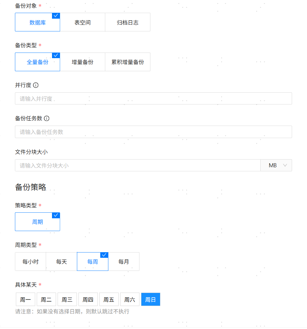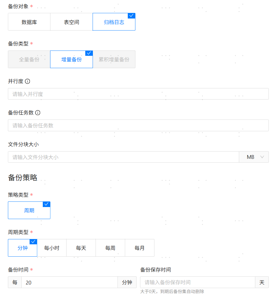 【周期类型】:必填参数,每小时/每天/每周/每月/分钟。其中分钟周期只支持归档日志备份。