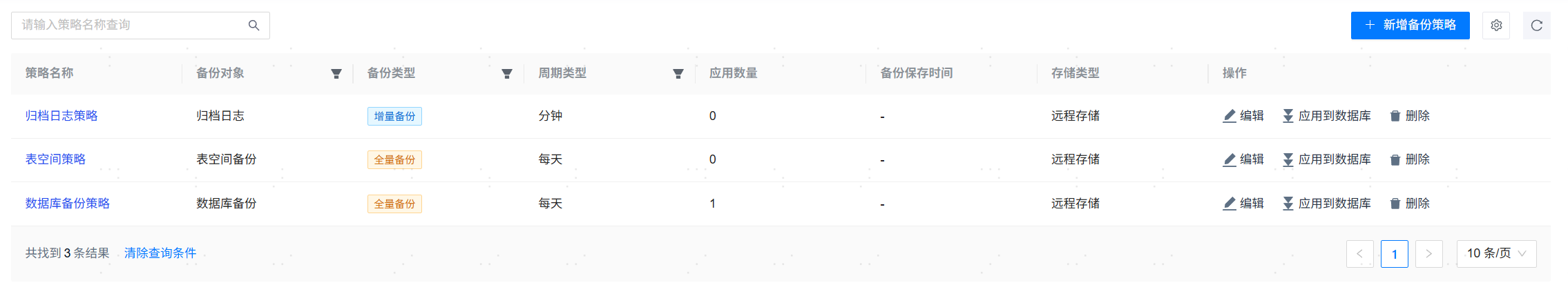 - 表空间备份策略所应用的表空间,在【应用到数据库】时指定。每个表空间都会生成一个单独的备份,并计入备份数量,请合理指定最大备份数量。