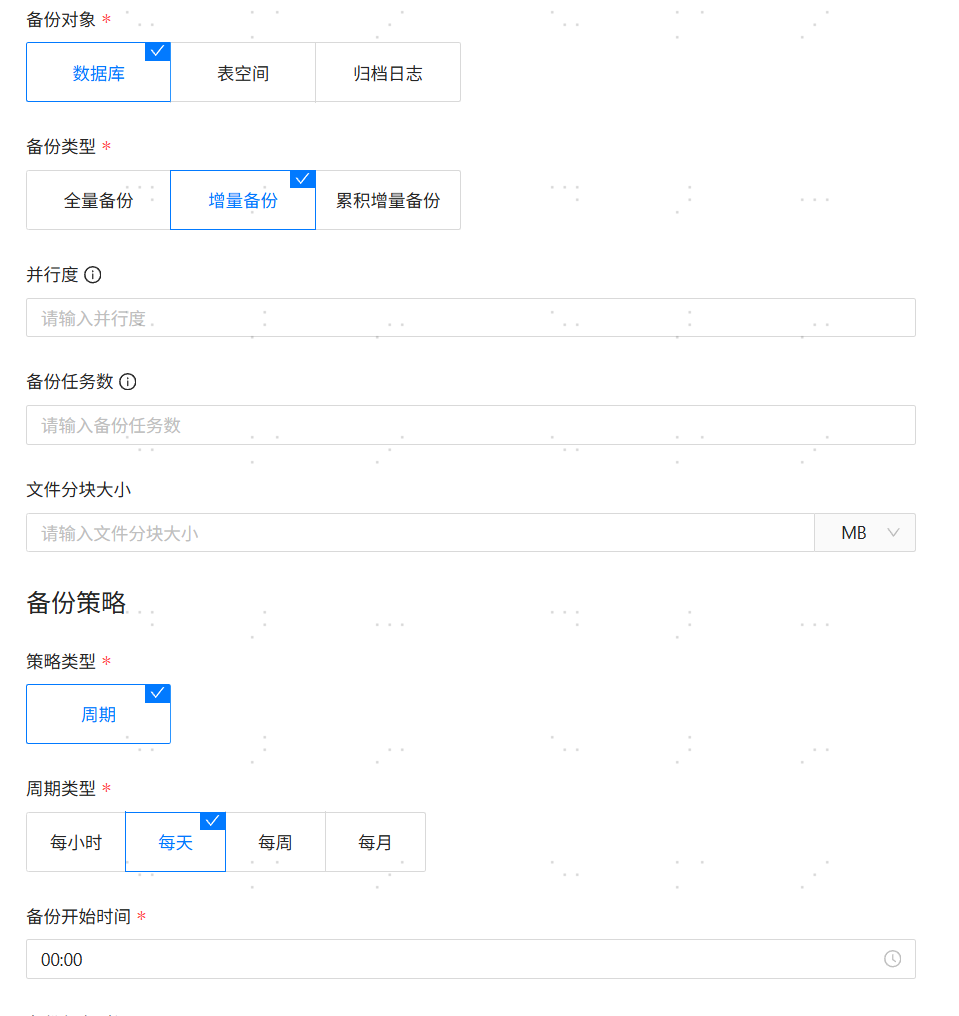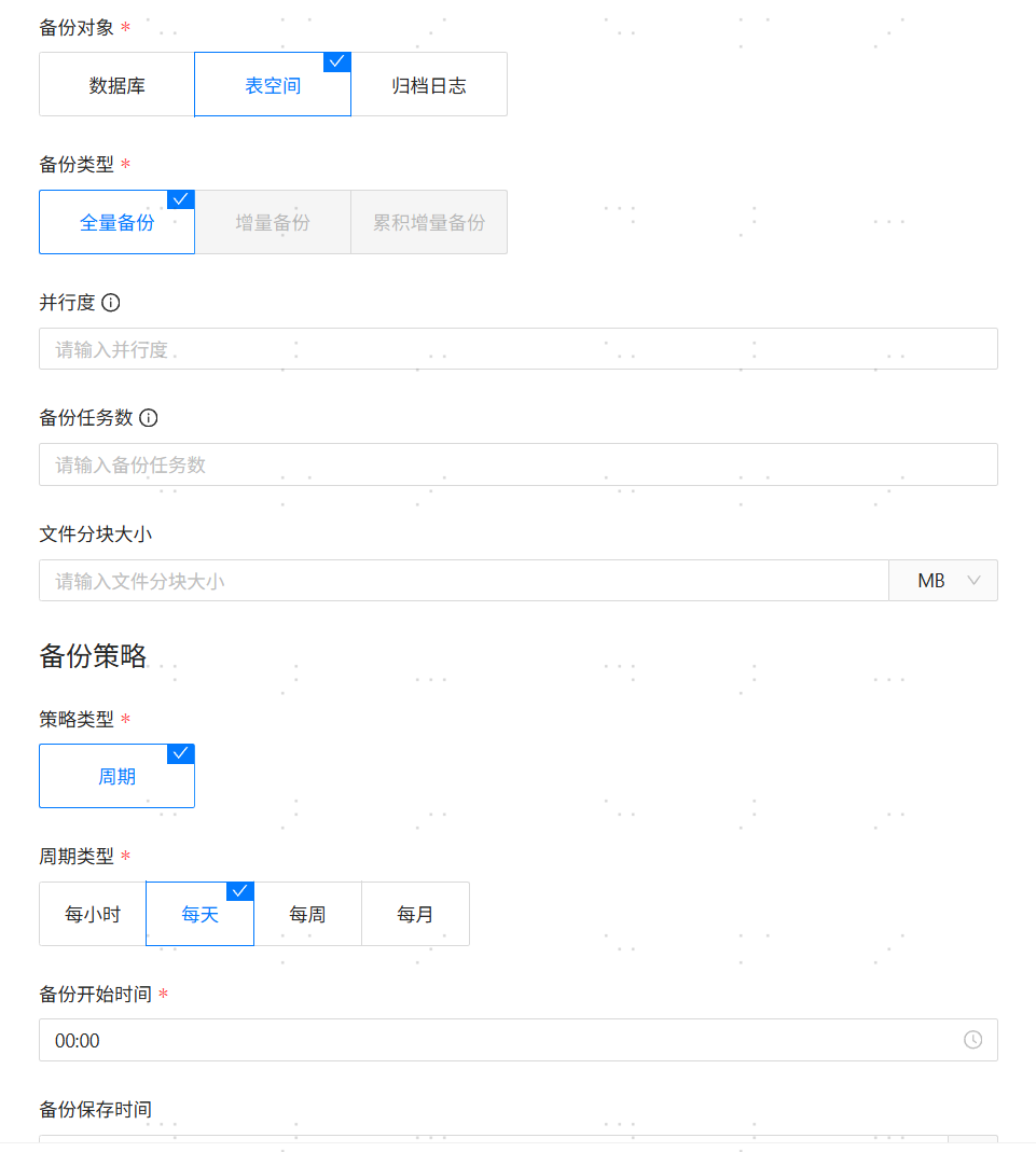 【备份对象】:必填参数,备份对象分为数据库、表空间和归档日志。