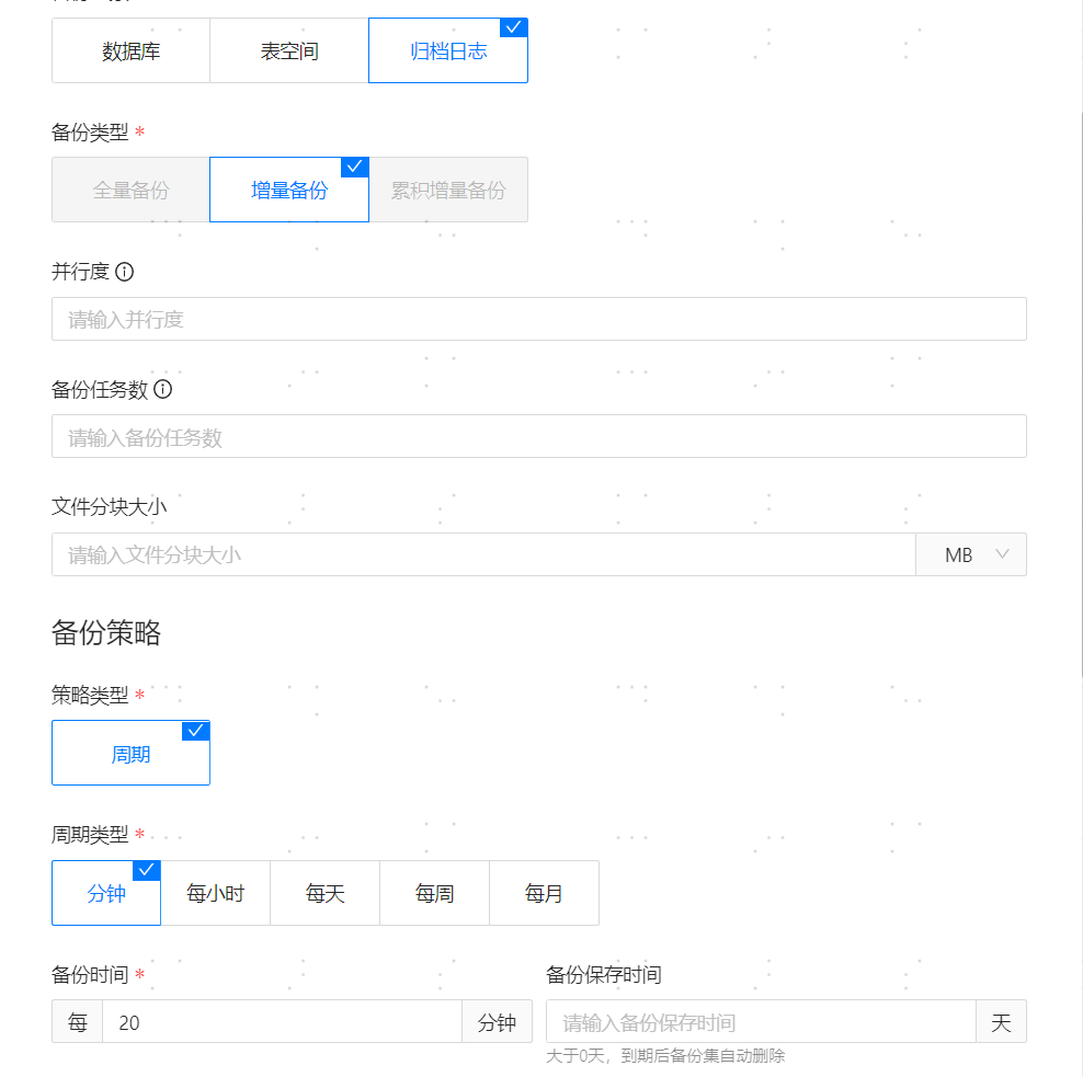 【备份时间】:分钟周期时该参数必填,相邻两次备份的分钟间隔时间。