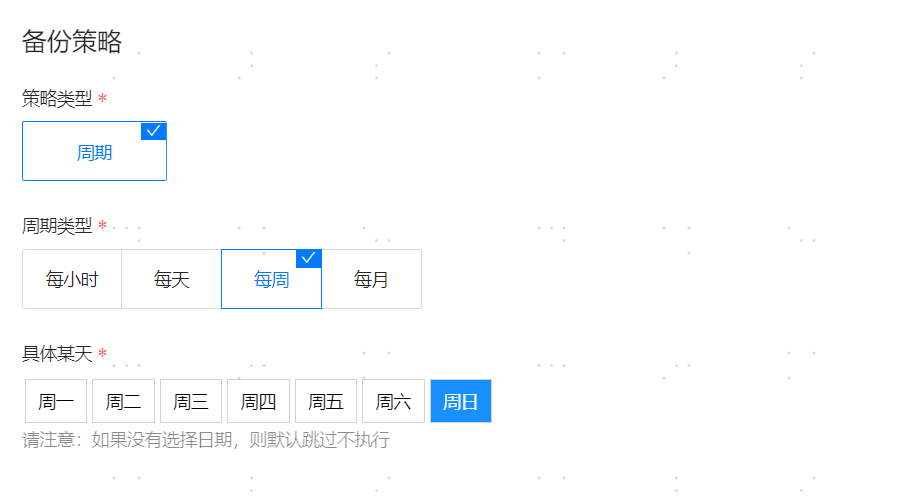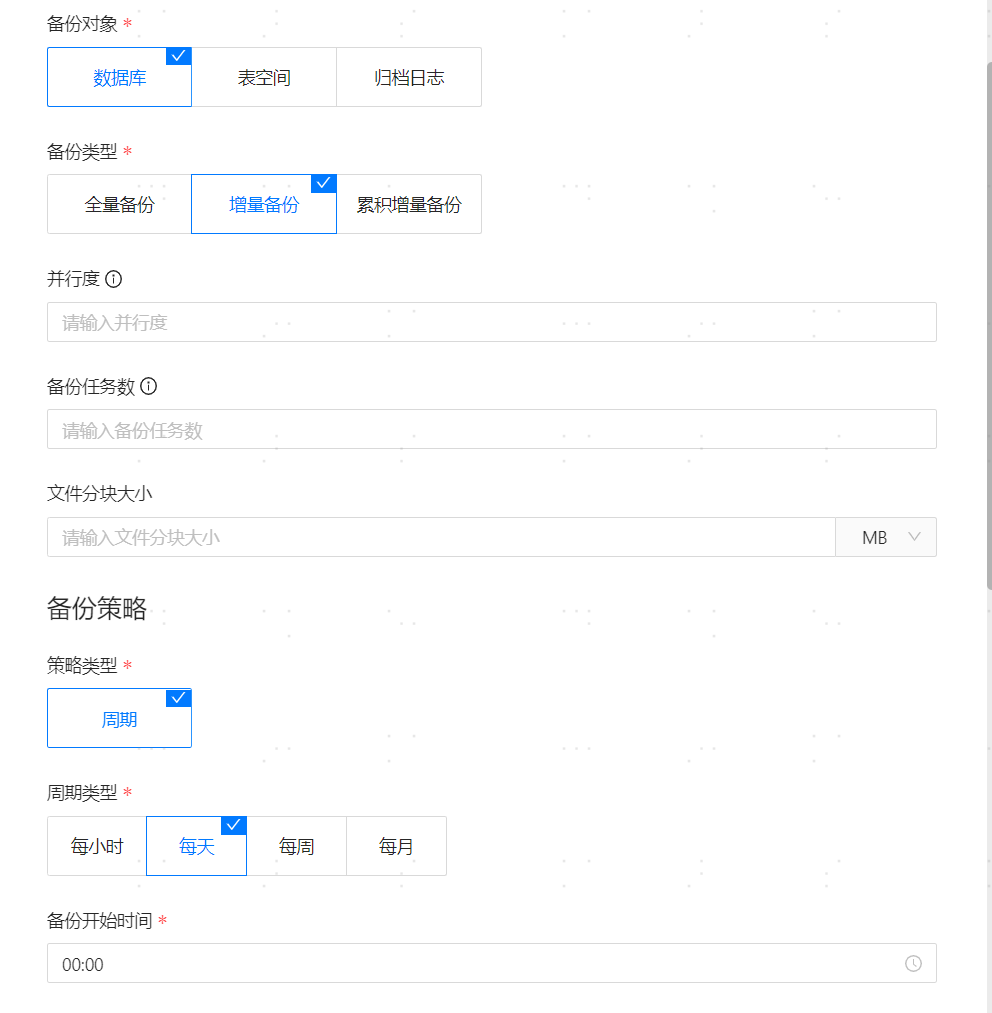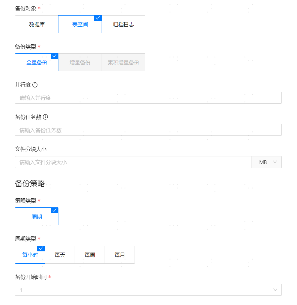 【周期类型】:必填参数,每小时/每天/每周/每月/分钟。其中分钟周期只支持归档日志备份。