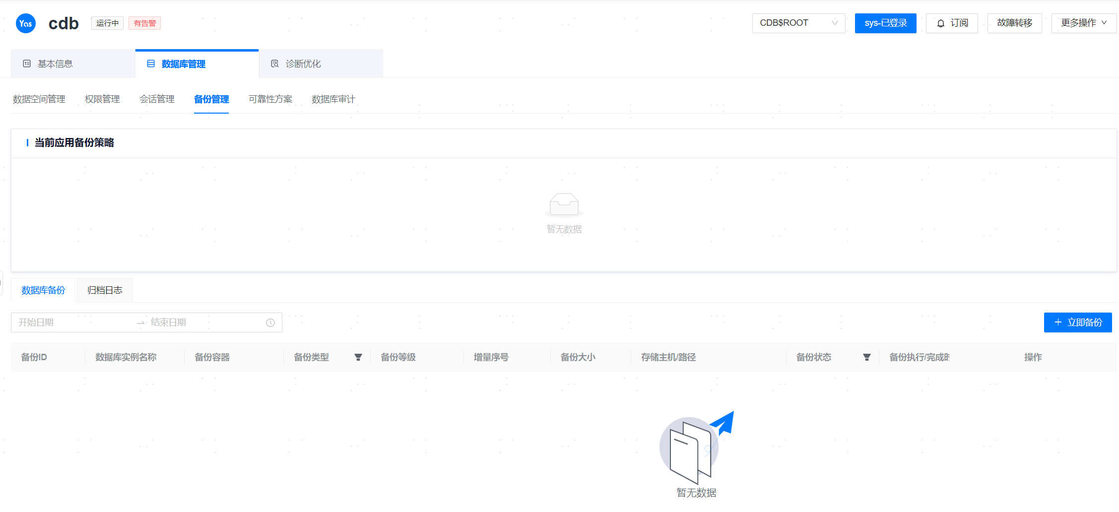 若登录用户为PDB,只能看到当前PDB的备份策略和备份集。