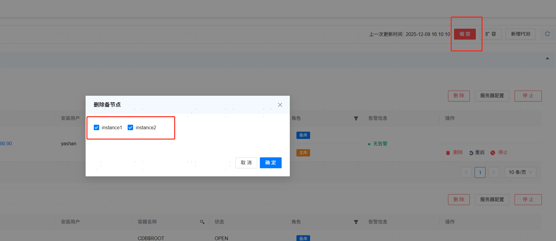 在数据库实例区域,点击 [缩容]。