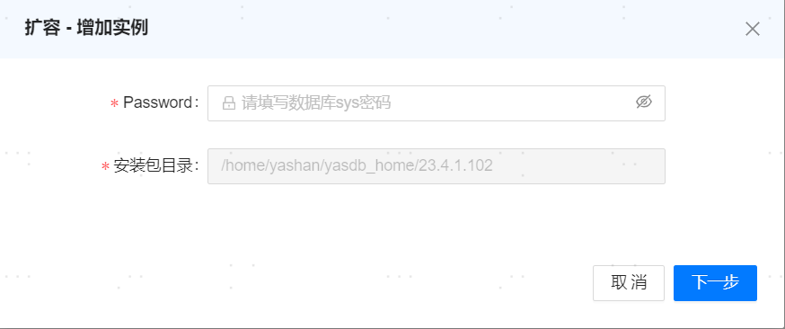 - 在数据库实例区域,点击扩容,输入sys用户密码。确认信息无误后,单击 [下一步] 。