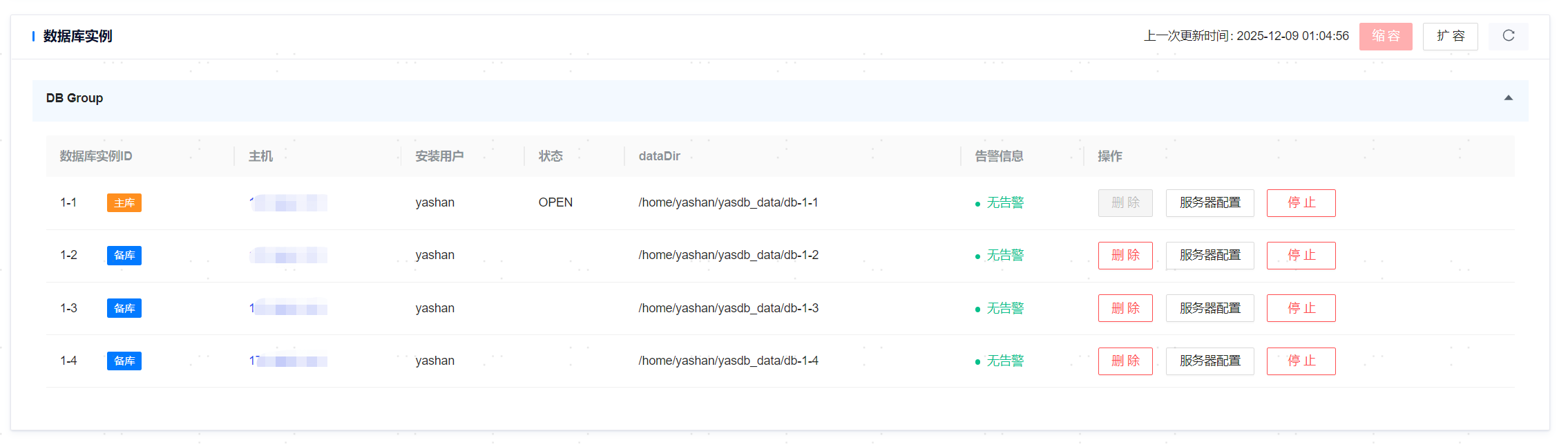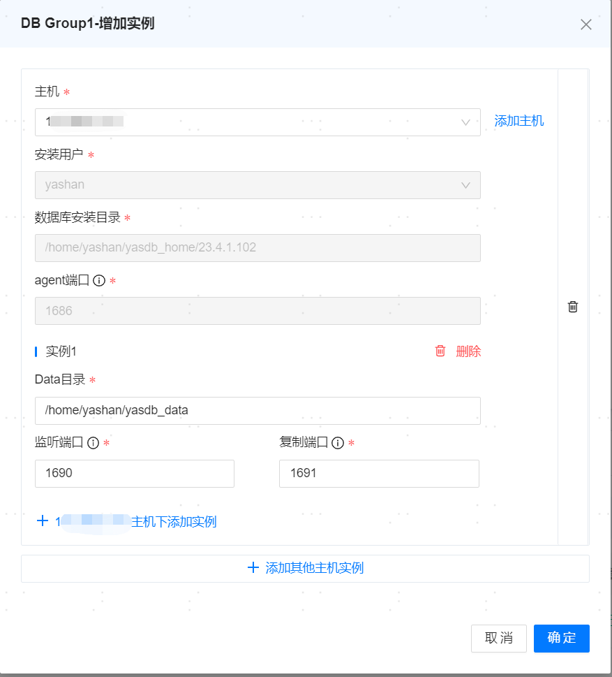 单机部署数据库下,支持增加数据库的备节点;共享集群部署数据库下,支持增加主group的的实例节点。若扩容节点所在主机为新主机时,没有数据库节点以及yasagent进程,可以选择不同的主机用户安装新增节点。