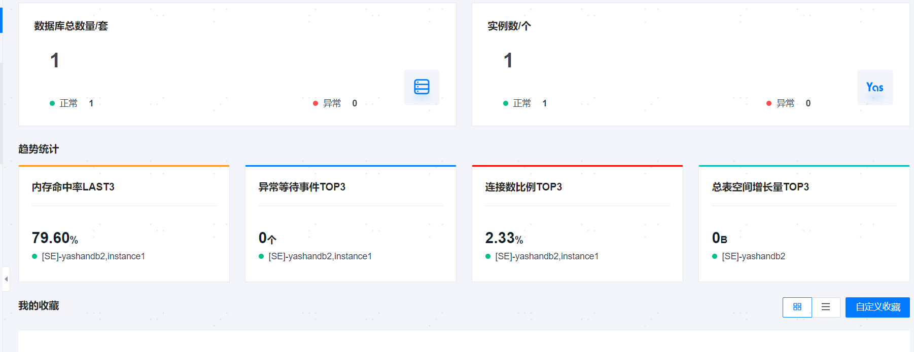 管理平台支持自定义收藏需要重点关注的数据库,收藏成功后对应数据库的信息将展示在工作台页面,且会自动订阅该资源。最多支持收藏5个数据库。