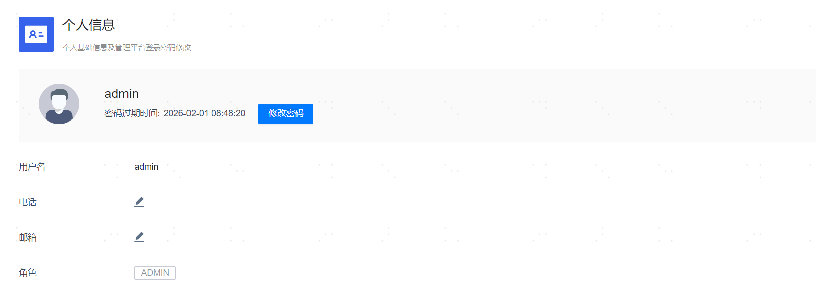 个人信息页面展示了平台用户的相关信息,包含用户名、电话(手机号码)、邮箱和角色,您可以按需修改手机号码和邮箱。