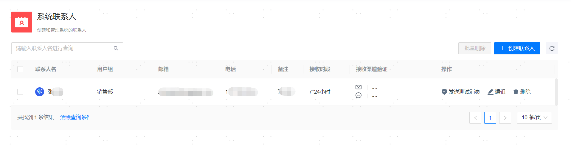 根据联系人的接收渠道相关配置可以向其发送【邮件测试】或【短信测试】消息,检查确认通知服务是否可用以及接收渠道是否消息可达。