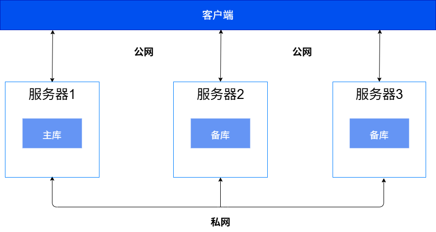 单机部署的典型组网如下图所示,该组网方案以一主两备为例,主库和各个备库建议分别部署在不同的服务器上。