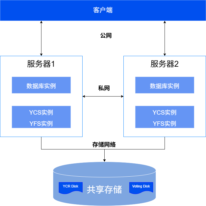 共享集群部署的典型组网如下图所示,该组网方案以2台服务器 + 1台共享存储搭建双实例单库共享集群环境为例,实例应部署在不同服务器上。