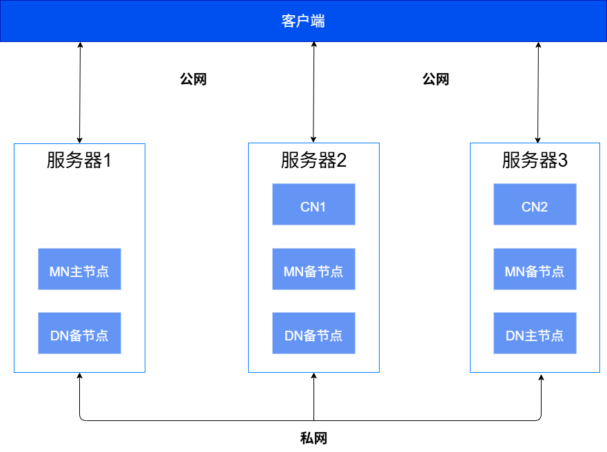 分布式部署的典型组网如下图所示,该组网方案以1个MN组、2个CN、1个DN组(DN组和MN组均为1主2备)为例,各组的主备节点建议分别部署在不同的服务器上。