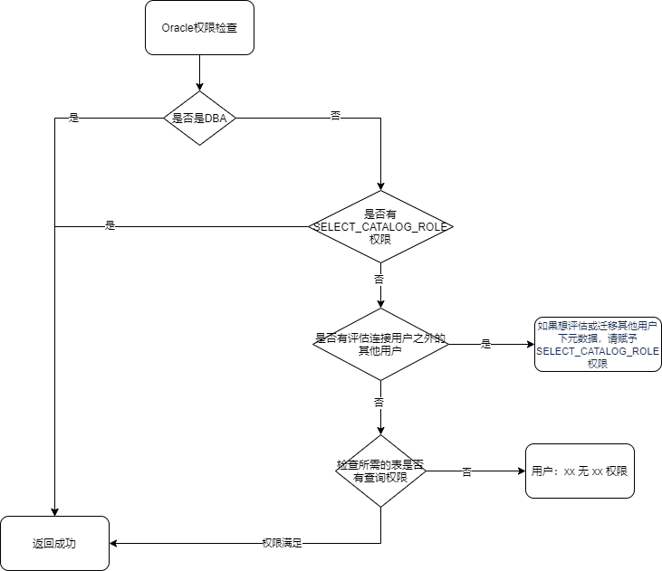 点击【下一步:开始迁移评估】时,或者不评估选择完迁移对象点击【确定范围】时,YMP会进行连接用户的权限检查,如果没有相关权限,会报出相关权限缺失,您需要对该用户赋予相关权限。对于Oracle的连接用户的权限检查顺序,可参考如下: