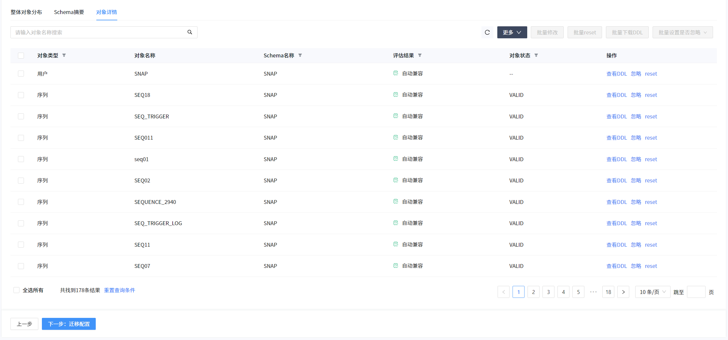 按照schema和对象类型对评估结果进行分类统计,展示每个schema下不同对象类型的兼容个数和比例。并对schema进行数据量和迁移时间进行统计。