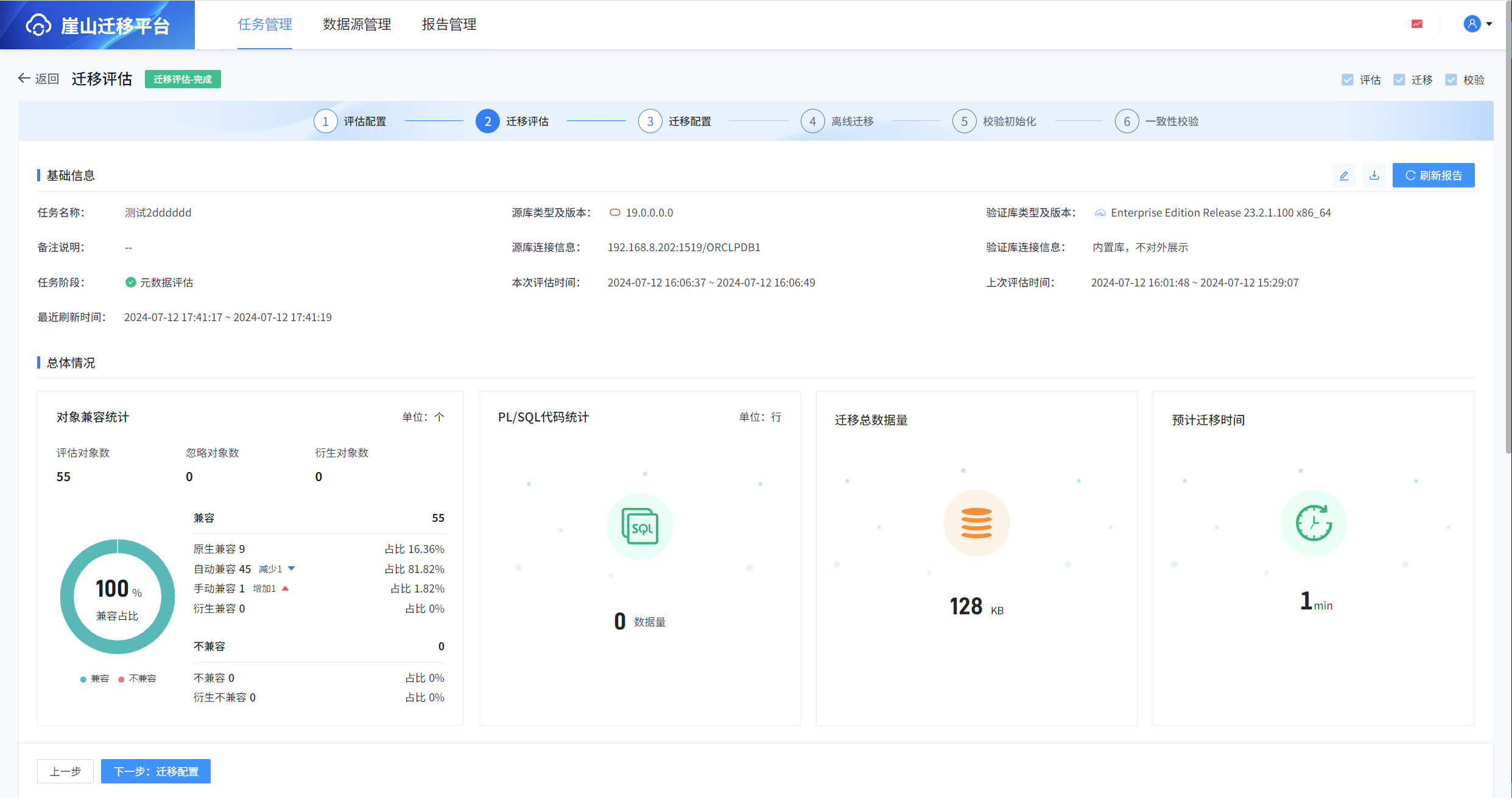 展示该任务的对象兼容度统计信息,PL/SQL的代码兼容度统计信息,不兼容类型的统计信息,迁移总数据量和预计迁移时间。