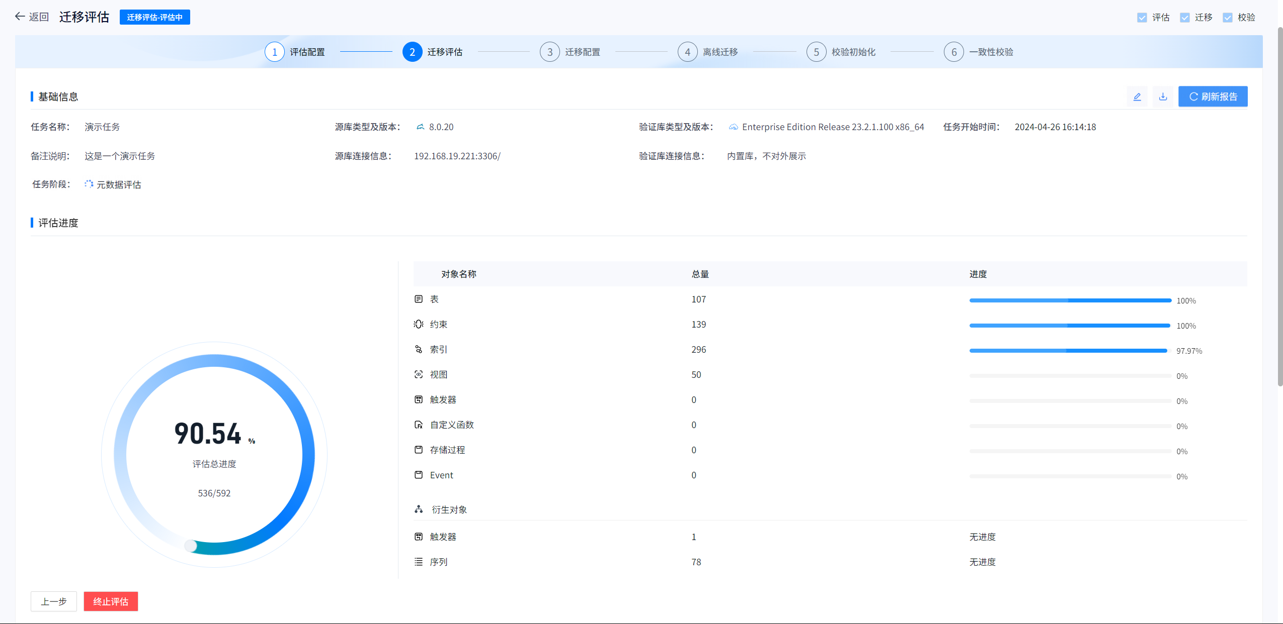点击【上一步】,返回到评估配置阶段,此次评估数据不会保留。再次点击【下一步:开始迁移评估】将重新进行评估。