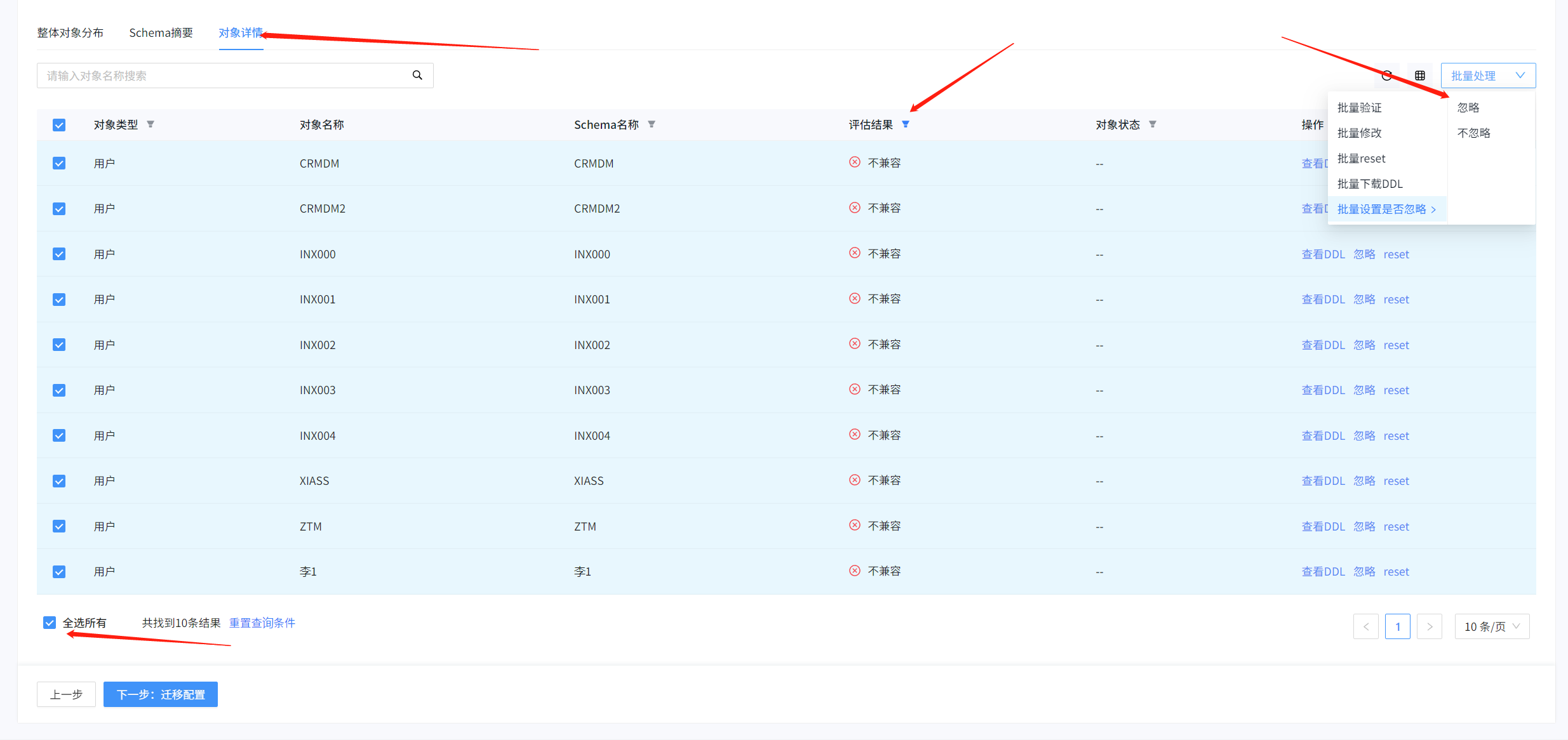 - 可以批量选择对象验证其兼容性,验证结束后弹窗会展示成功个数,失败、未执行的个数和对象名信息。